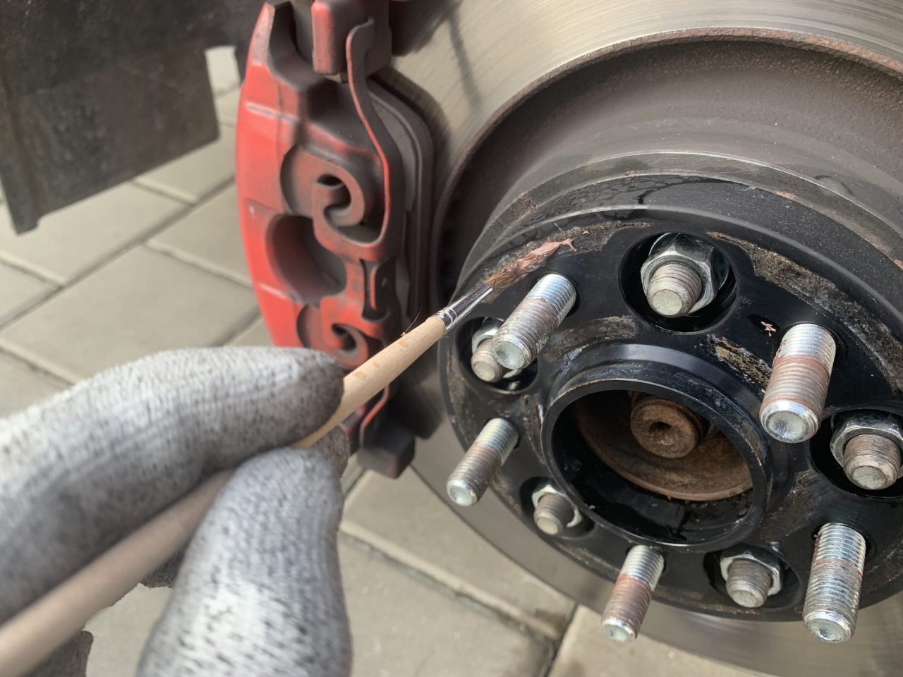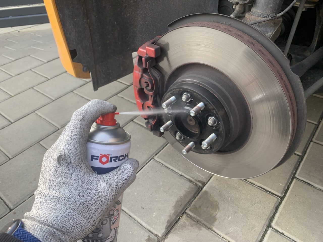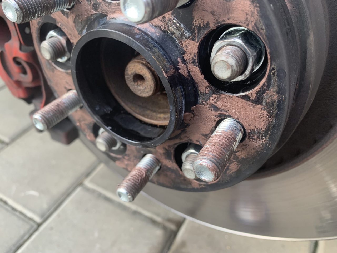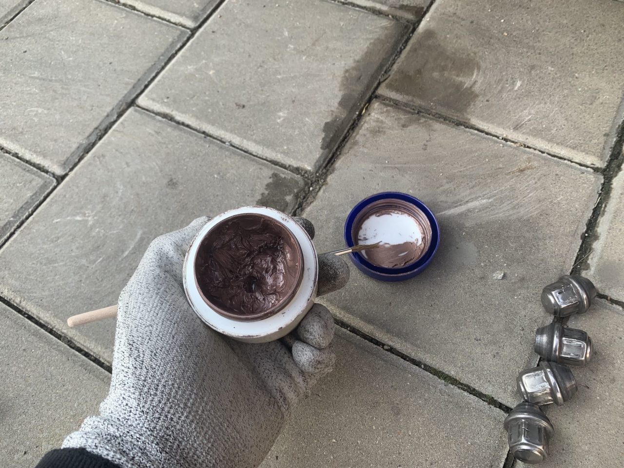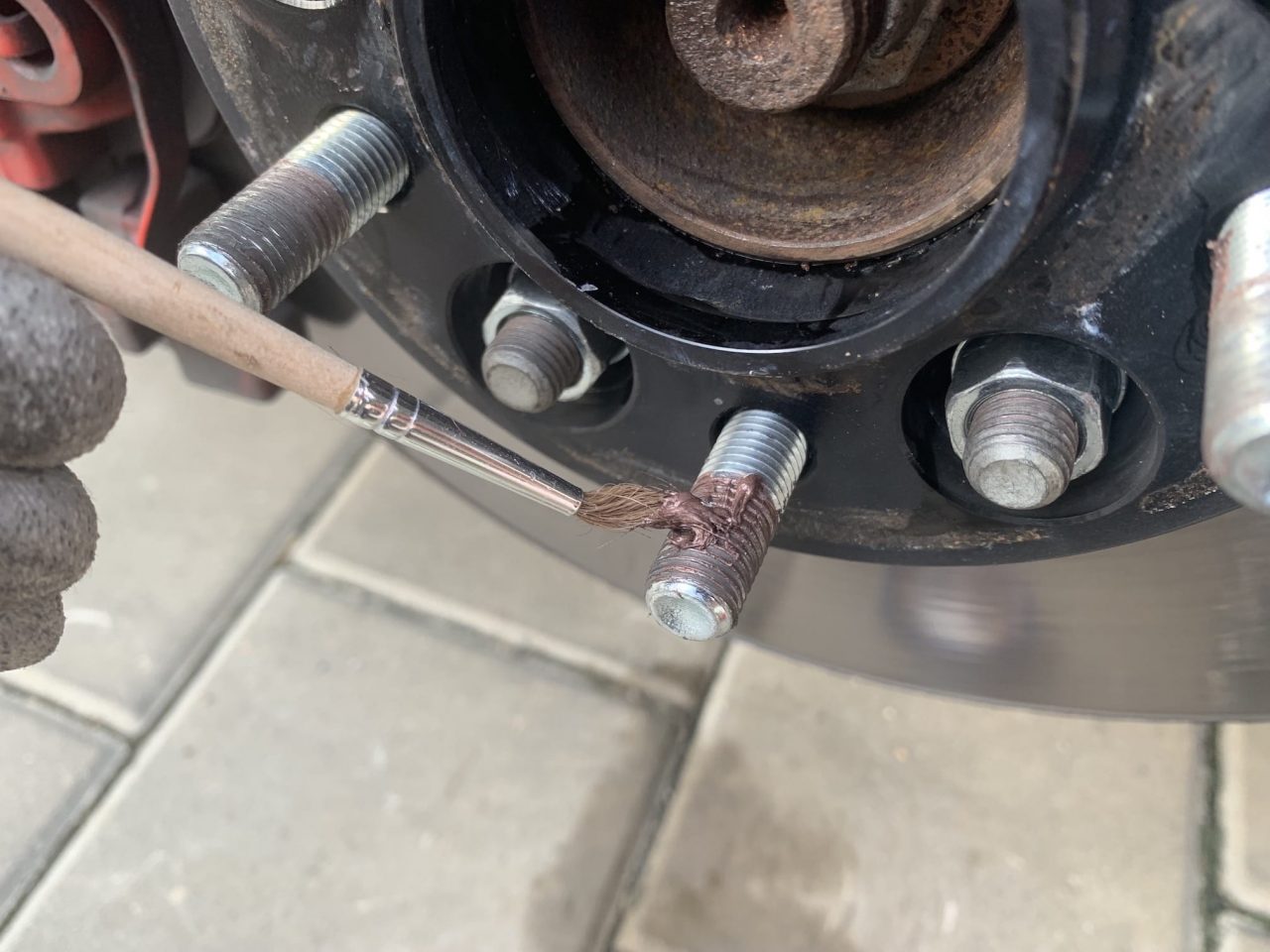 Po očištění náboje a styčných ploch můžete využít měděnou pastu, která slouží jako ochrana proti rzi a „připečení“ kola k náboji. Názory na tento krok se různí, já osobně mám s měděnou pastou dobré zkušenosti. Máte-li měděnou pastu ve spreji, tak ji opatrně stříkněte, jestliže máte měděnou pastu tuhou, můžete ji nanést a rozetřít malým štětečkem. Nanáší se vždy tenká vrstva, a pouze na styčnou plochu náboje s kolem. Při této příležitosti můžete měděnou pastou lehce namazat i šrouby, čímž opět zamezíte rezavění.