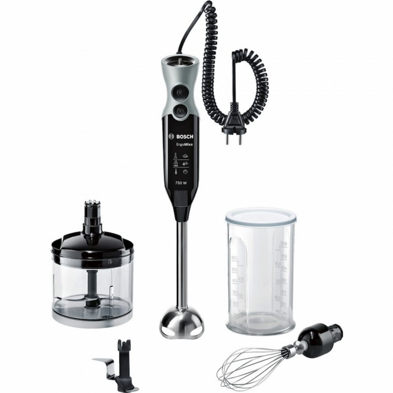 Výrobce: Bosch | Příkon: 750 W | Plynulá regulace rychlosti: ano | Počet rychlostí: 12 | Maximální otáčky: neuvedeno | Materiál těla: plast | Pulsní spínač: ano | Šlehání: ano | Sekání: ano | Drcení ledu: ano | Nádoba na mixování: ano, o objemu 0,75 l | Hmotnost: 1,5 kg